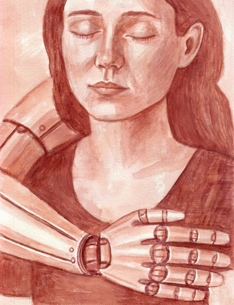 robot arm slaat een arm om een mens heen