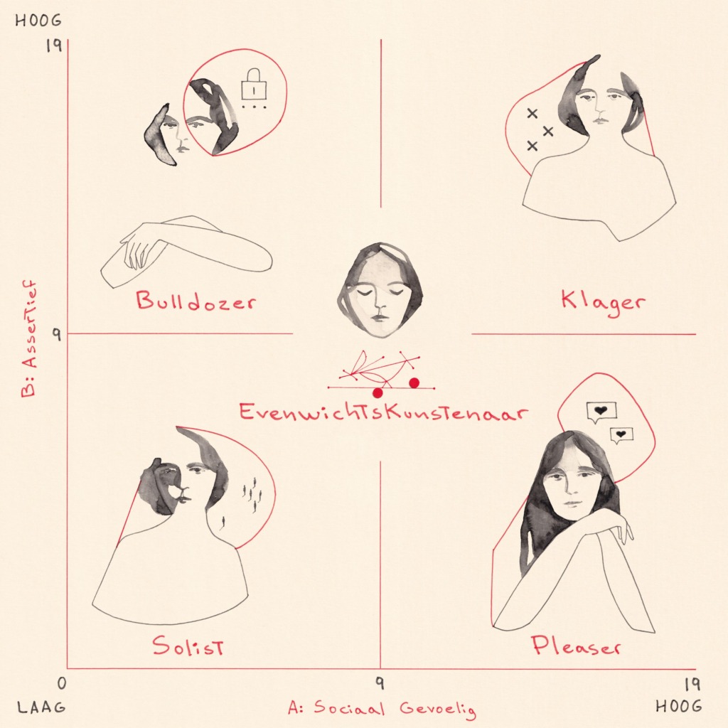 Valt je score op het snijpunt van de vier vlakken, dan ben je een evenwichtskunstenaar. Het ideale type, want hij kan goed voor zichzelf én goed voor de ander zorgen. Hij bewandelt de gulden middenweg, kan soepel meebewegen en is respectvol in sociale interacties.