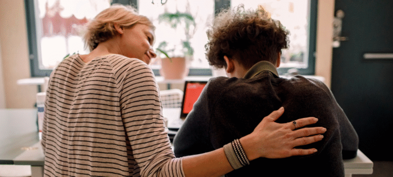 Vrouw legt een hand op de rug van een jongen om hem gerust te stellen.
